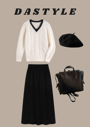 Ophelia Cozy White Cable Knit Sweater with Black V-Neck Trim - Perfect for Winter